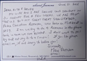 I can’t begin to tell you how special it was to make this connection with our Norwegian family. Lynnie and I will almost certainly be sailing back to Norway next summer, so will be seeing them again. And we are hoping to host them in the US anytime they are there. I know they are equally interested in getting to know their American cousins, so hopefully others will get a chance to meet them from time to time.